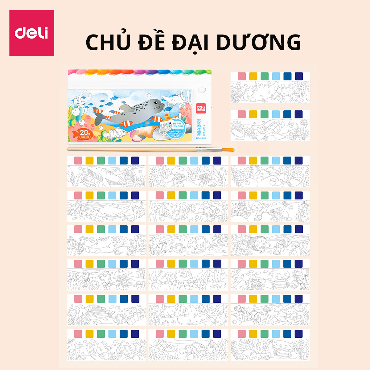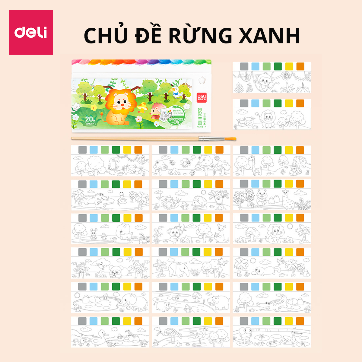 Review Bộ tranh tập tô màu nước cho bé Deli – 20 tờ – Kèm màu nước và cọ – Rừng Xanh/ Đại Dương – An toàn Sáng tạo học sinh